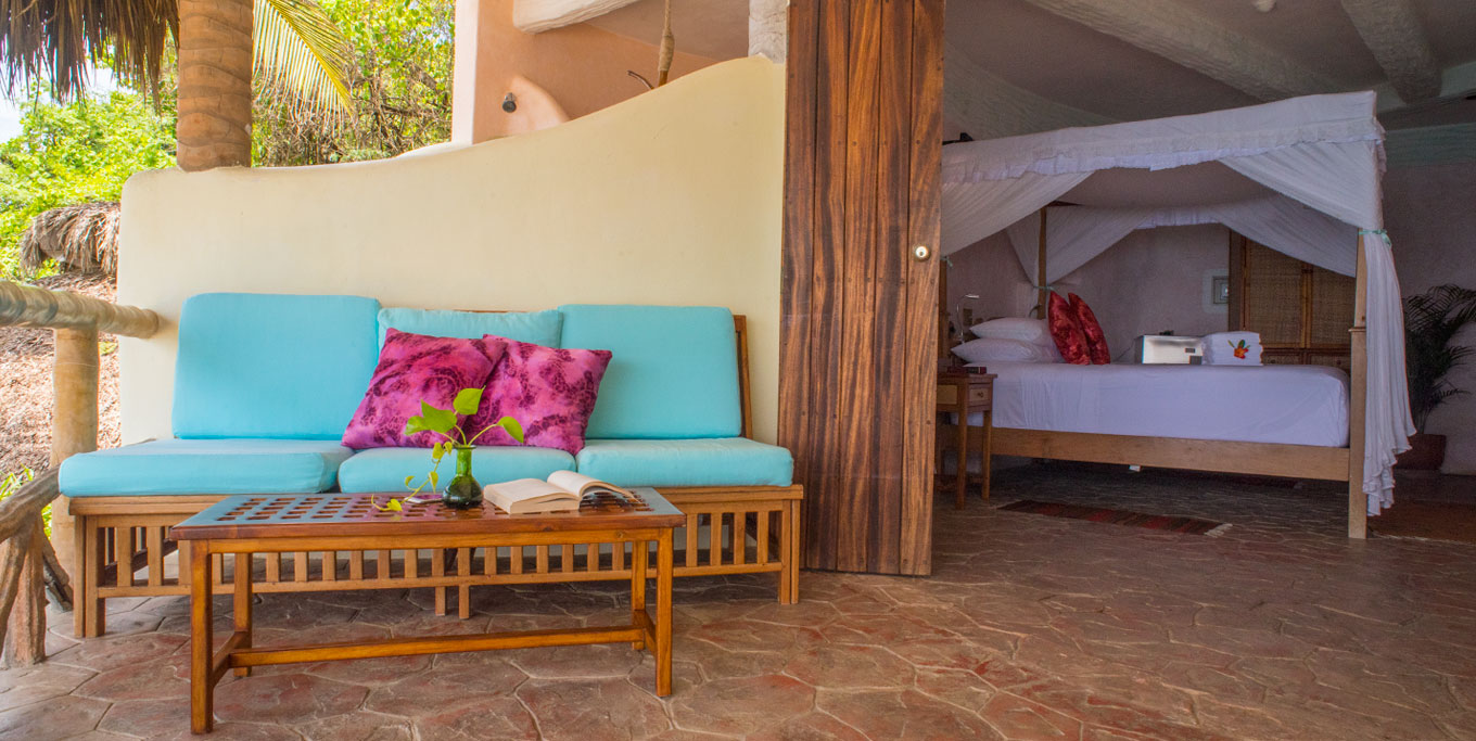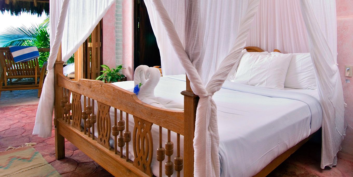 Deslizate a tu elegante cama de madera teca con pabellón blanco; siente la sensual frescura del algodón de tus sábanas; disfruta el romance, deja que el sonido del océano te lleve a sueños lejanos...