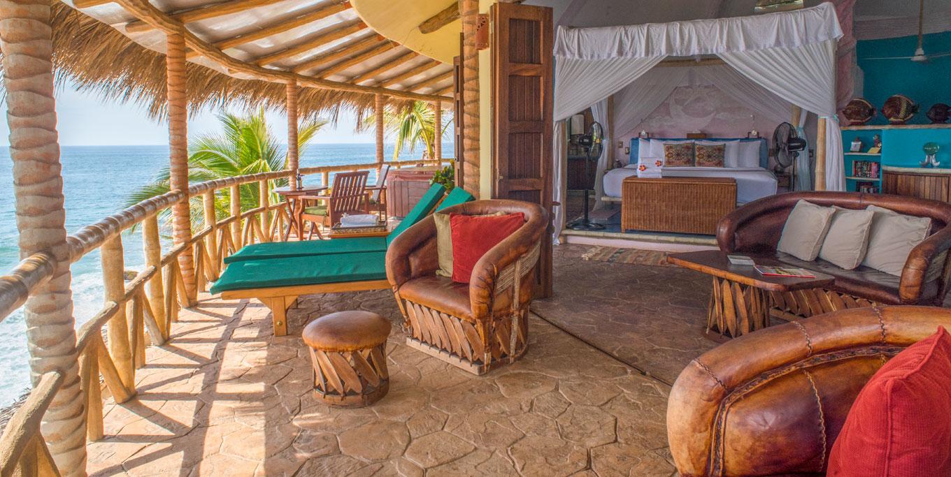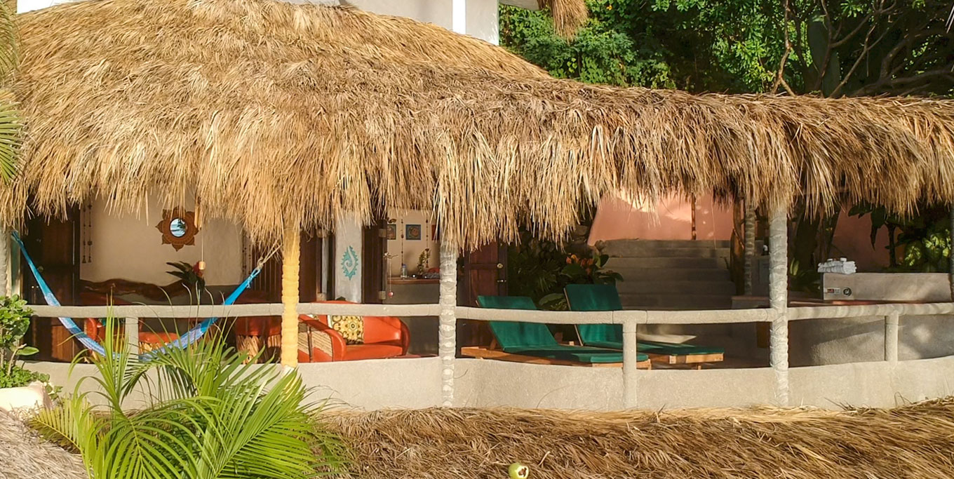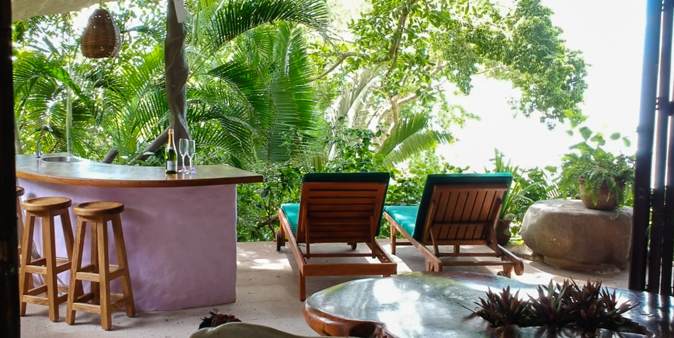 Saborea una bebida a la puesta del Sol en tu enorme terraza, o simplemente relájate bajo un enorme árbol de chalata, con la bella vista del mar entre árboles de plátanos y palmeras.
